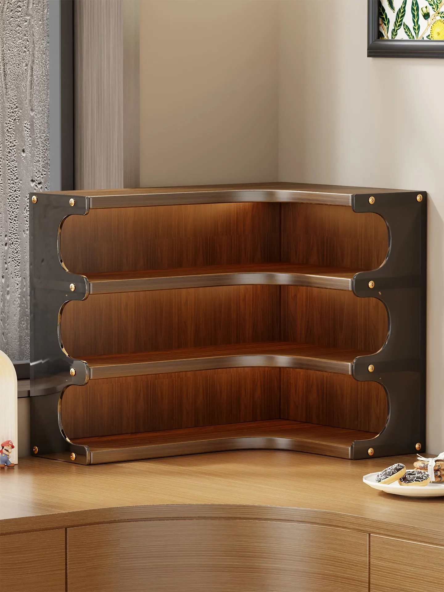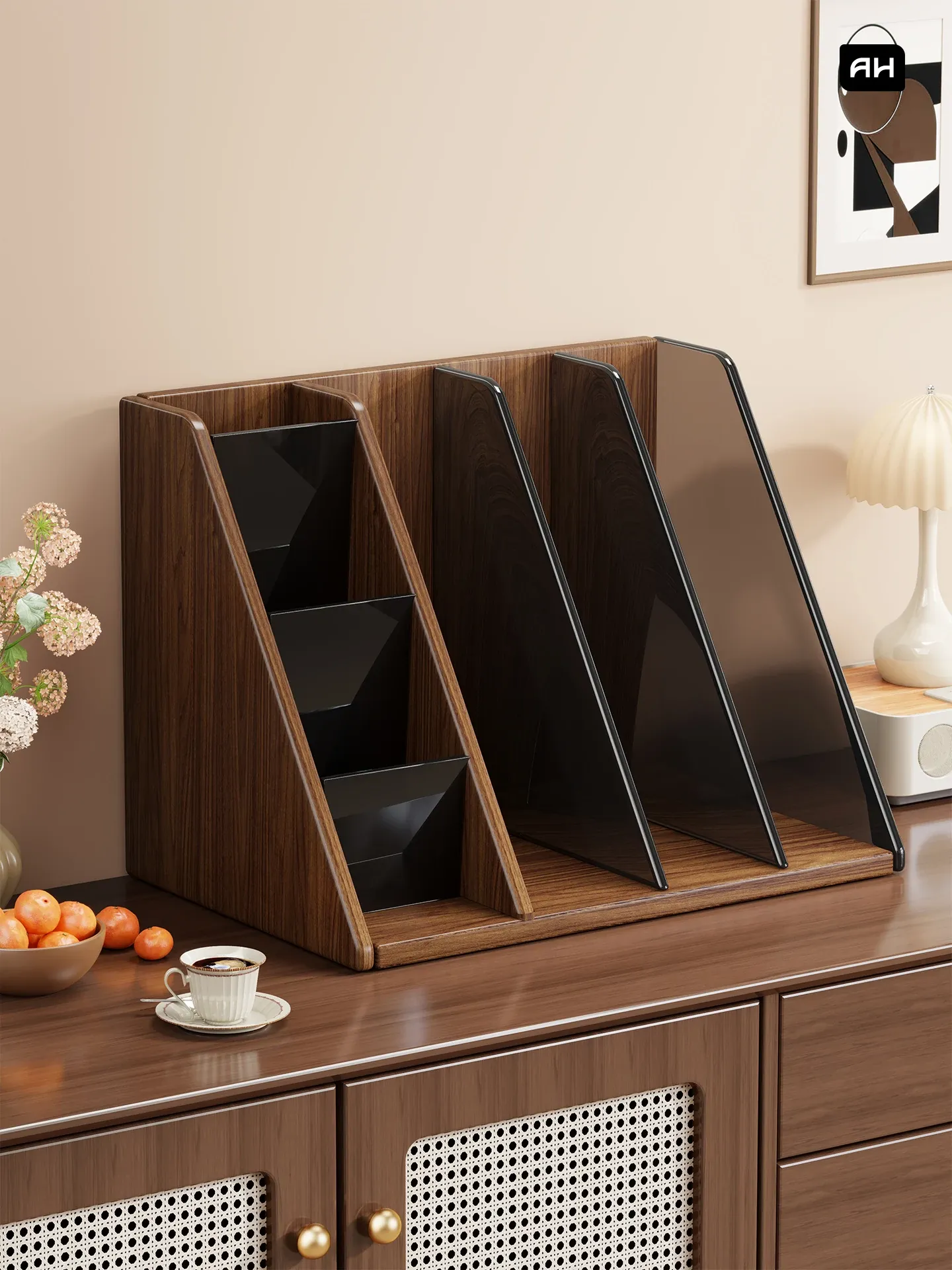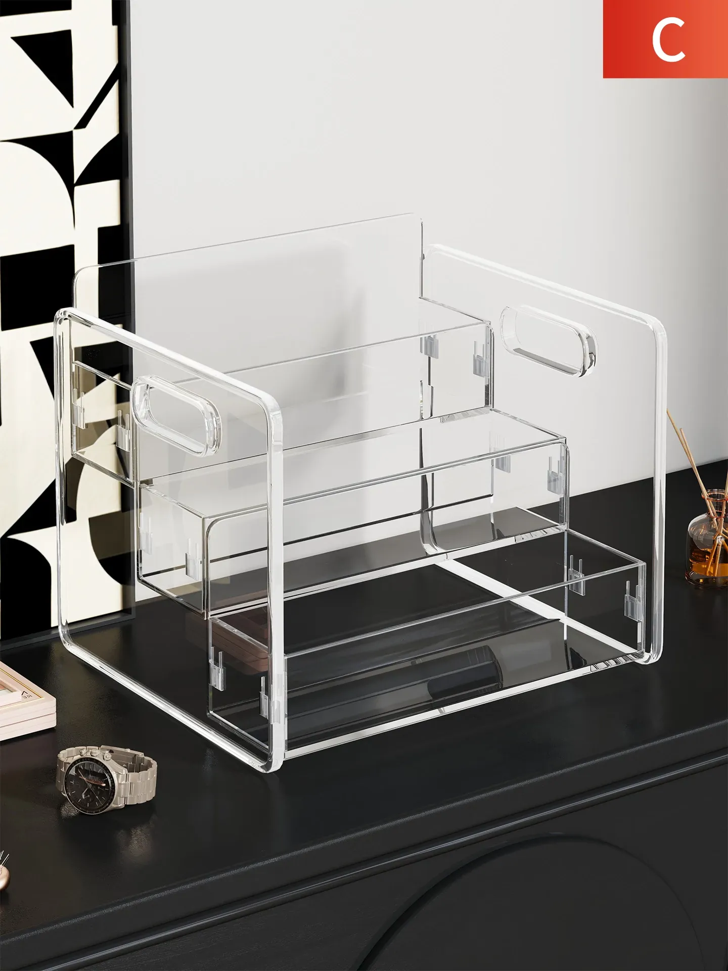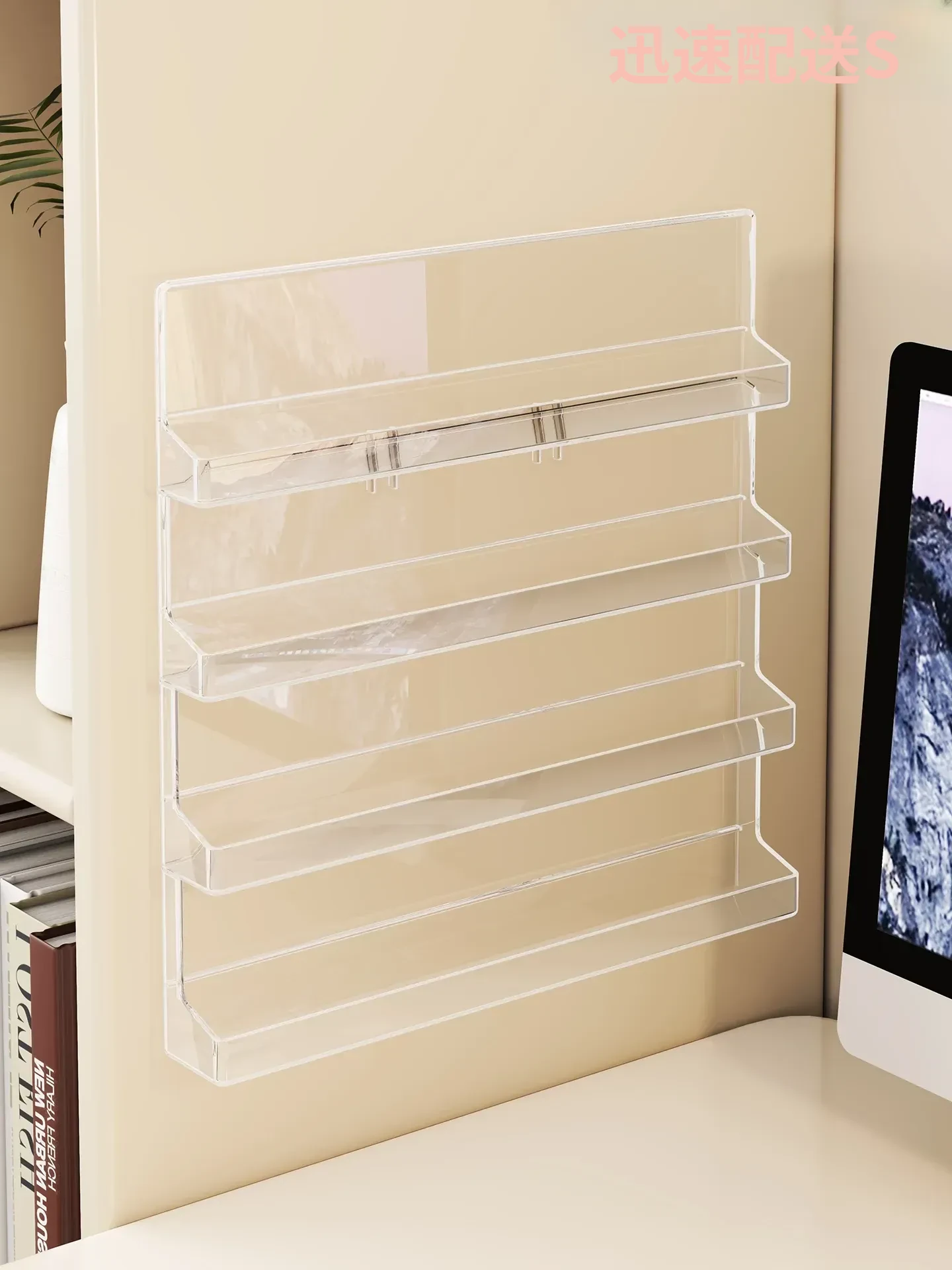 デスク用アクリル収納ラック - 角度にぴったりフィットする水杯&スナック収納、コンパクトで多層設計!作業スペースをスッキリ整理し、毎日の生活をもっと快適に。