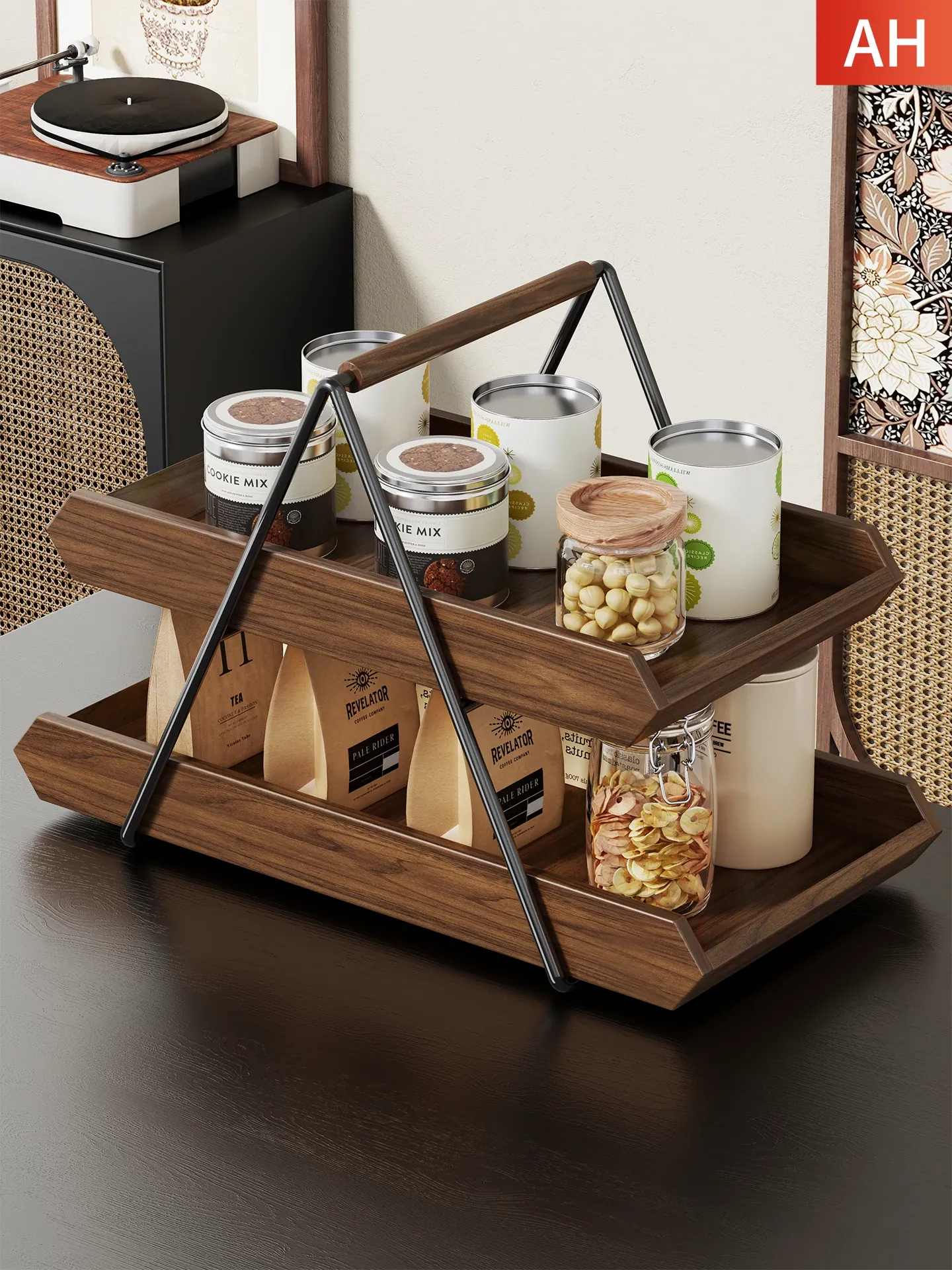 実木製ダイニングテーブル収納付きおやつラック - リビングやキッチンに最適な多層スナックスタンド!おしゃれなカップホルダー付きで、便利でスタイリッシュな空間を演出します。