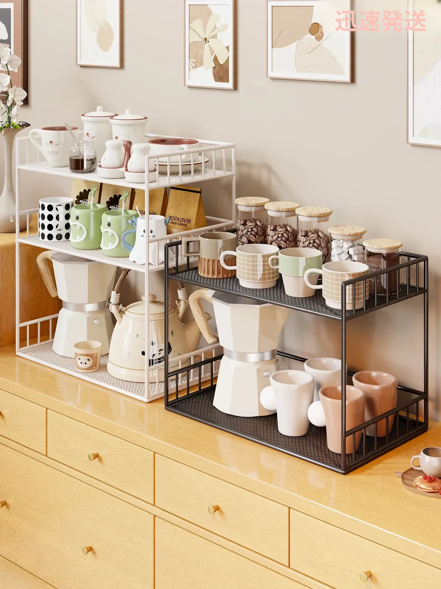 デスク用収納ラック|マグカップスタンド|ダブルレイヤーのティーセット置き場|おしゃれなテーブル収納で、ティータイムをもっと楽しく!水分補給もスマートに!
