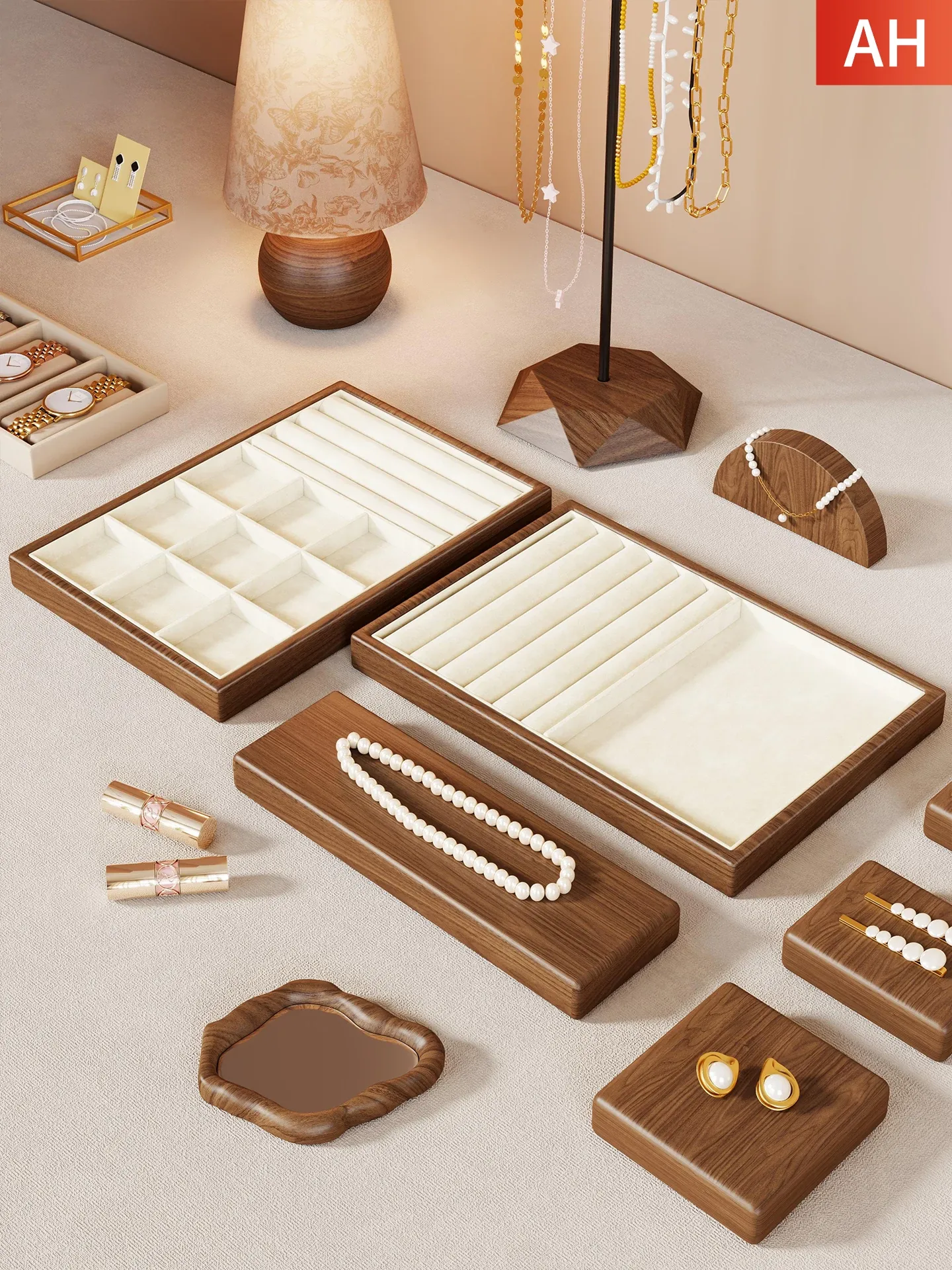 実木製ジュエリーボックス - 引き出し付きリング・ピアス・ネックレス・ブレスレットのディスプレイトレイ、アクセサリーの仕分け収納ラック、耳飾りプレートで美しく整理整頓!